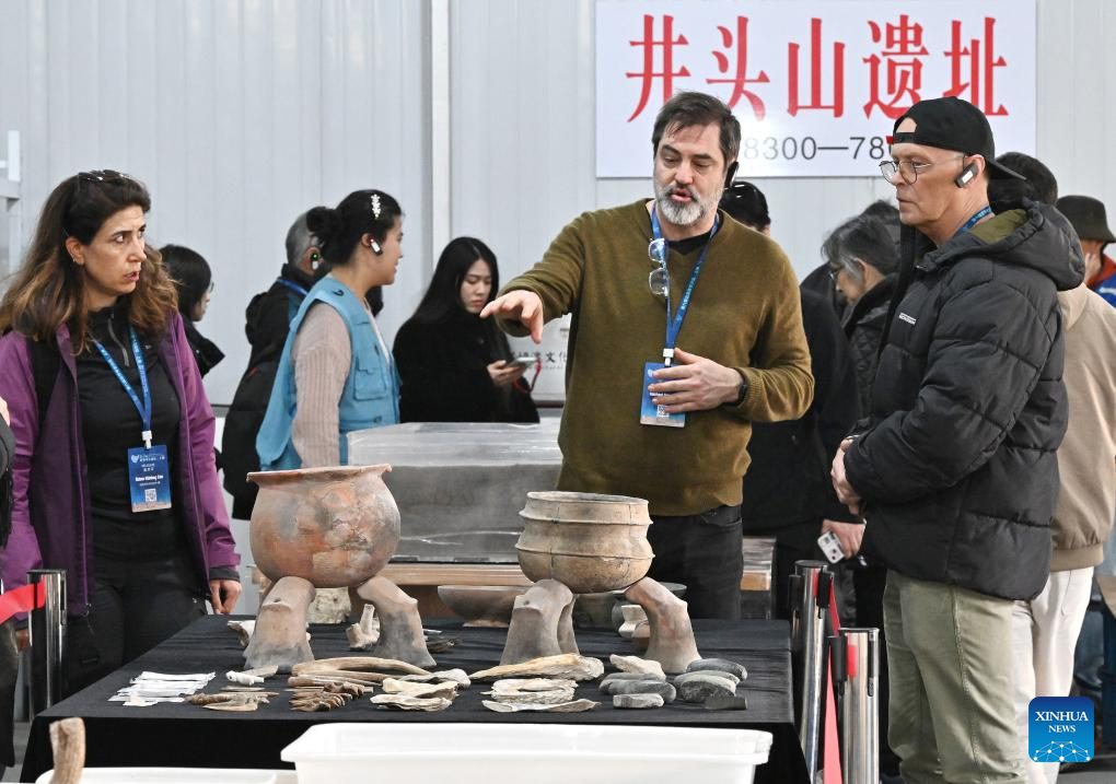 Experts and scholars attending the sixth Shanghai Archaeology Forum (SAF2025) visit the cultural relics storage room of Jingtoushan Site in Yuyao city of Ningbo, east China's Zhejiang province, on Dec. 15, 2025. [Photo/Xinhua]