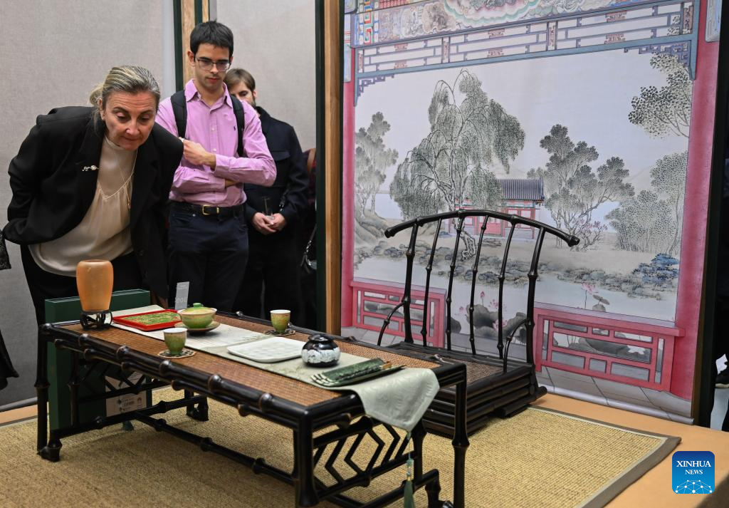 Visitors view exhibits during an exhibition titled "Anshan Cuijin - an Exhibition of Chinese Life Aesthetics" at the China Cultural Center in Madrid, Spain, Dec. 16, 2025. The exhibition kicked off here on Tuesday and will run until March 2026, presenting the elegant charm of Chinese aesthetics. [Photo/Xinhua]