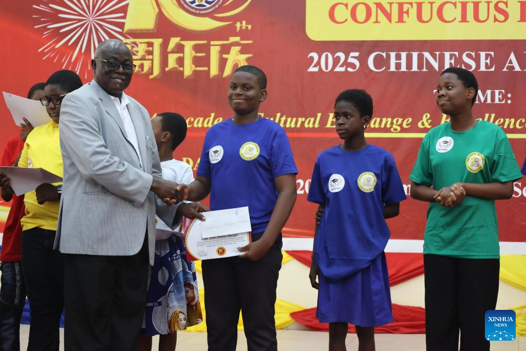 A student (3rd R) receives an award during a celebration marking the 10th anniversary of the Confucius Institute at the University of Cape Coast in Cape Coast, capital of Ghana's Central Region, Dec. 15, 2025. [Photo/Xinhua]