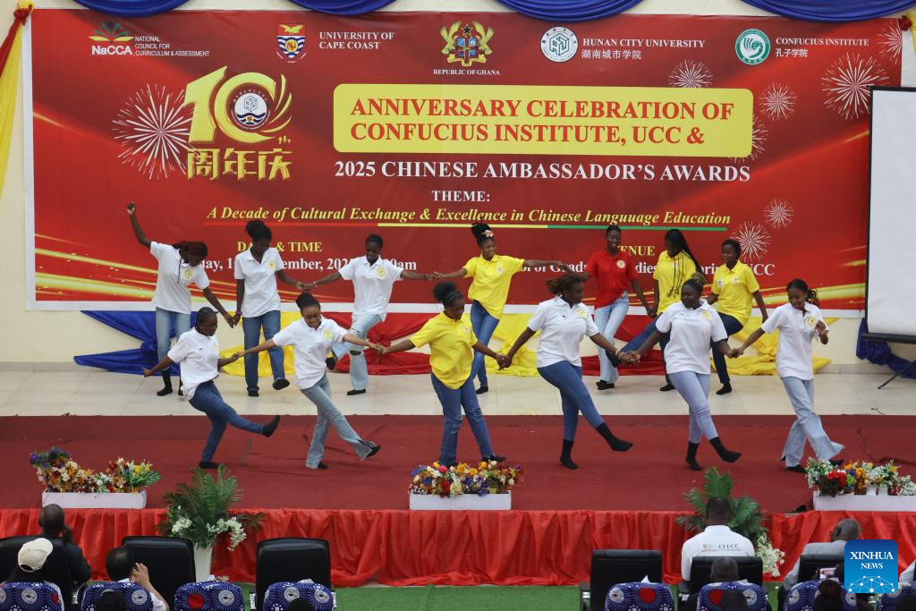 Students perform during a celebration marking the 10th anniversary of the Confucius Institute at the University of Cape Coast in Cape Coast, capital of Ghana's Central Region, Dec. 15, 2025. [Photo/Xinhua]