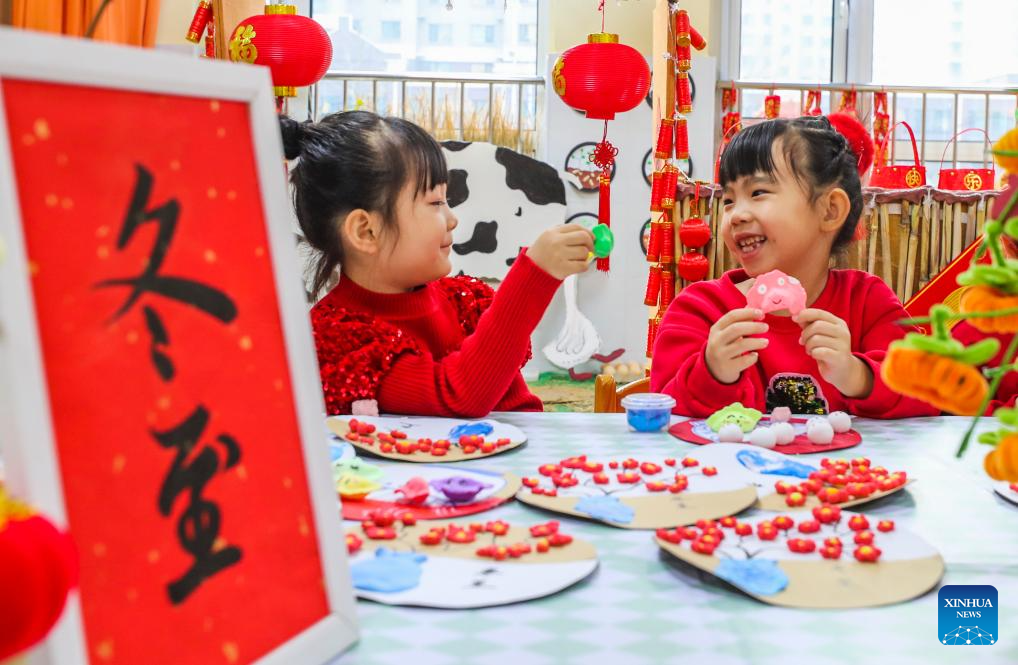 Children of a kindergarten make dumpling-shaped crafts in Tangshan City, north China's Hebei Province, Dec. 18, 2025. People all over the country held diverse events on Thursday to mark the Winter Solstice, which will fall on Dec. 21 this year.