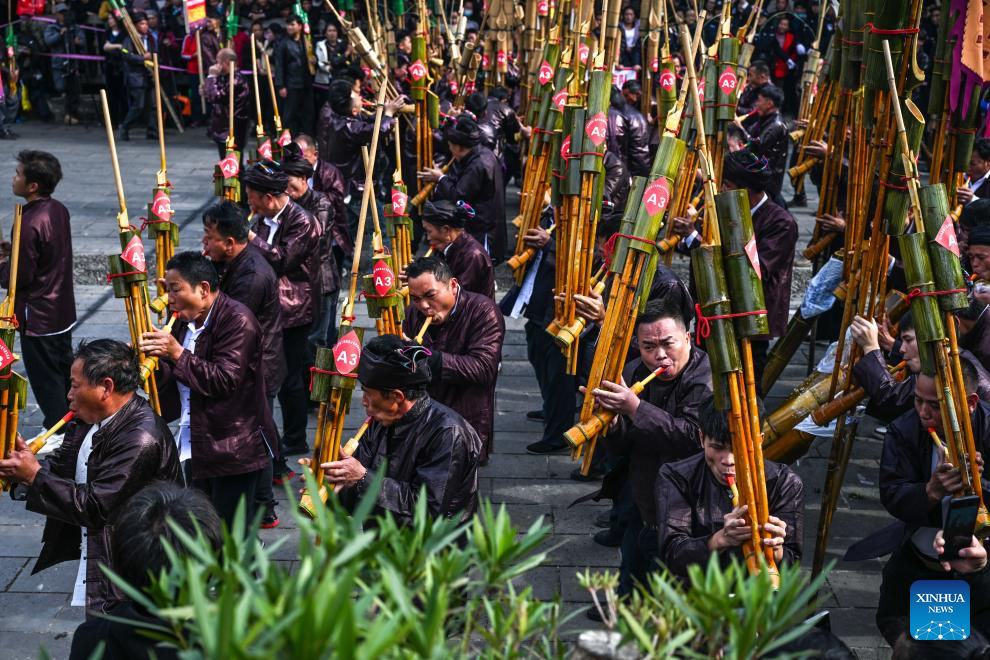 People of Dong ethnic group play Lusheng, a traditional reed-pipe wind instrument, during an event in celebration of the Dong New Year at Zhaoxing Dong village of Liping County, Qiandongnan Miao and Dong Autonomous Prefecture, southwest China's Guizhou Province, Dec. 20, 2025. Dong New Year, a traditional festival for harvest and gathering, was enlisted as one of China's national intangible cultural heritages in 2011. Various activities were held in Liping County over the weekend. (Xinhua/Yang Wenbin)