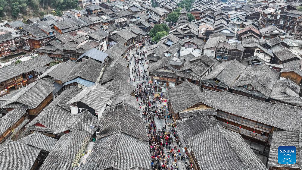 An aerial drone photo taken on Dec. 20, 2025 shows a performance team parading during an event in celebration of Dong New Year at Zhaoxing Dong village of Liping County, Qiandongnan Miao and Dong Autonomous Prefecture, southwest China's Guizhou Province. Dong New Year, a traditional festival for harvest and gathering, was enlisted as one of China's national intangible cultural heritages in 2011. Various activities were held in Liping County over the weekend. (Xinhua/Tao Liang)