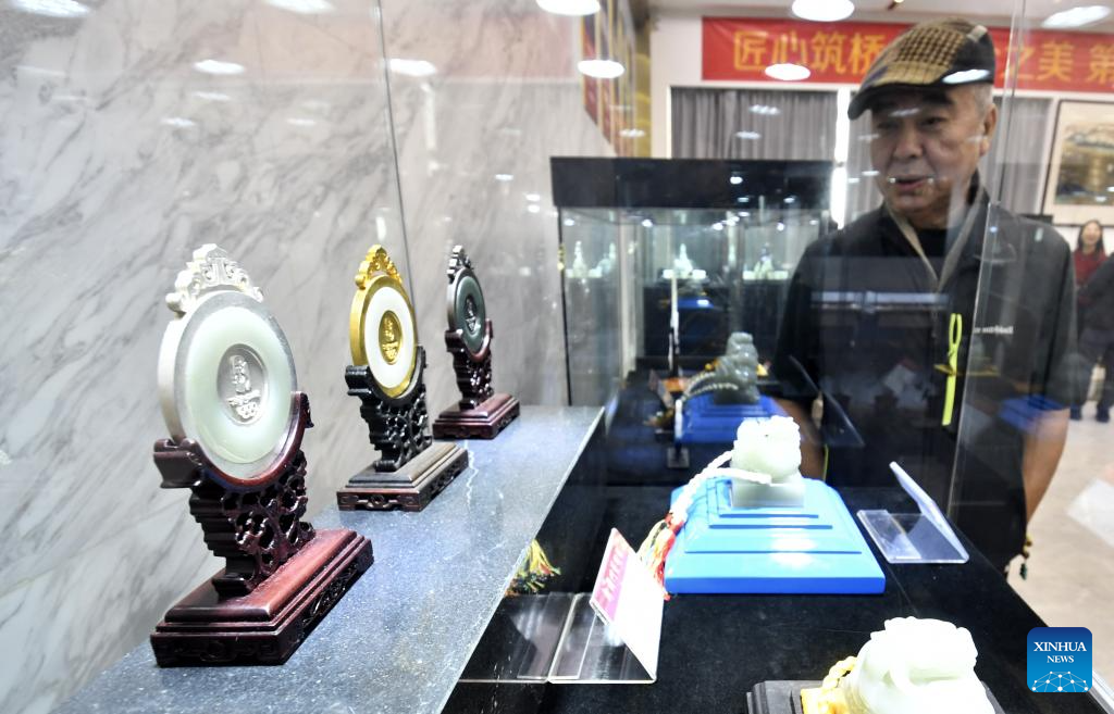 A visitor views jade carving works at an exhibition of intangible cultural heritages in Beijing, capital of China, Dec. 19, 2025.