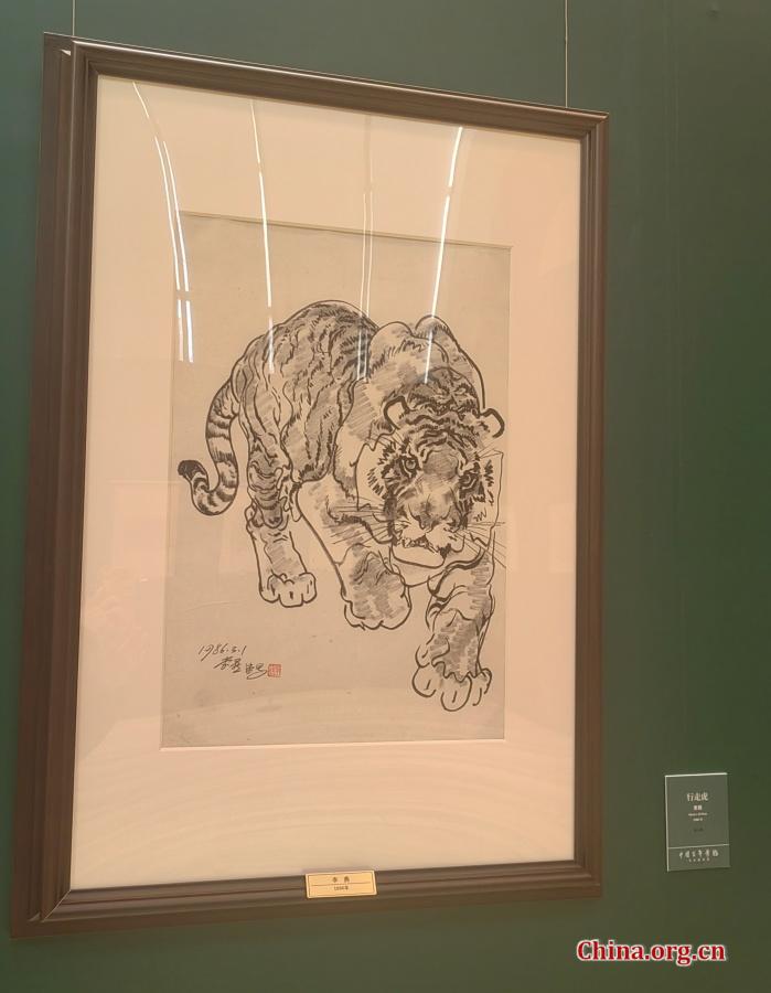 A sketch of a walking tiger by Li Yan, 1988, is displayed at an exhibition hosted by the China National Academy of Painting in Beijing, Dec. 29, 2025. [Photo by Liu Sitong/China.org.cn]