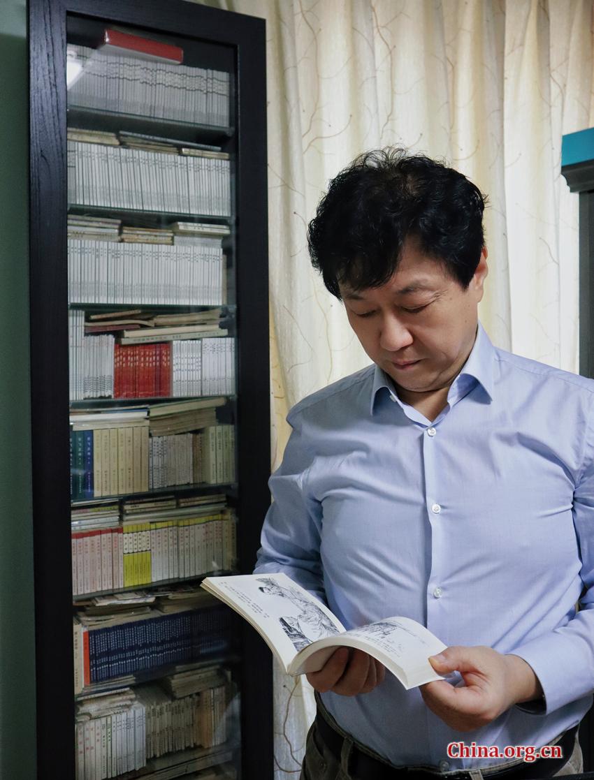 Collector Li Jian among his collection of more than 8,000 volumes of lianhuanhua at home in Beijing, Dec. 27, 2025. [Photo/China.org.cn]