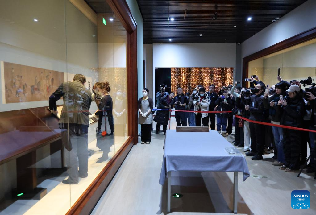 Staff members prepare a Song Dynasty (960-1279 AD) replica of the painting "Lady Guoguo's Spring Outing" for exhibition at Liaoning Provincial Museum with the presence of journalists in Shenyang, northeast China's Liaoning Province, Dec. 29, 2025. The painting, attributed to Tang Dynasty (618-907 AD) court painter Zhang Xuan, is one of the figure painting masterpieces depicting aristocratic women. The work will be on display at Liaoning Provincial Museum from Dec. 30, 2025 to March 29, 2026. (Xinhua/Li Gang)