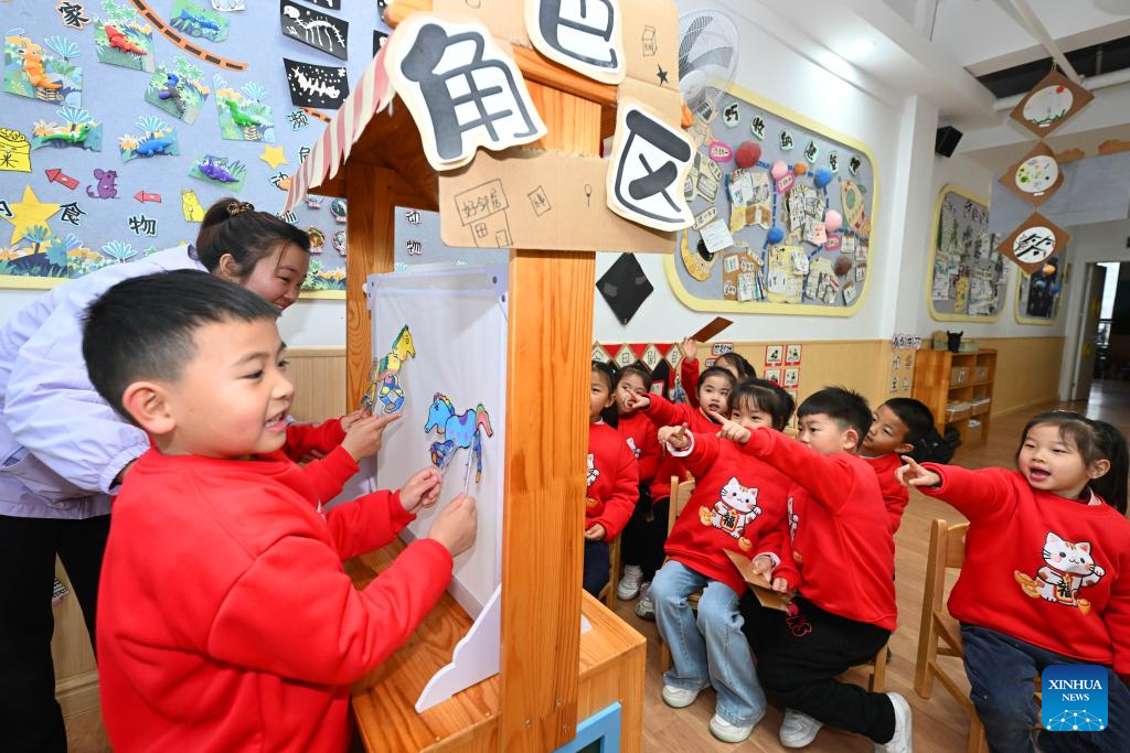 A child tries shadow puppetry in a kindergarten in Xiangyang City, central China's Hubei Province, Dec. 29, 2025. Various activities are held across China to celebrate the upcoming new year. (Photo by Li Xuhui/Xinhua)