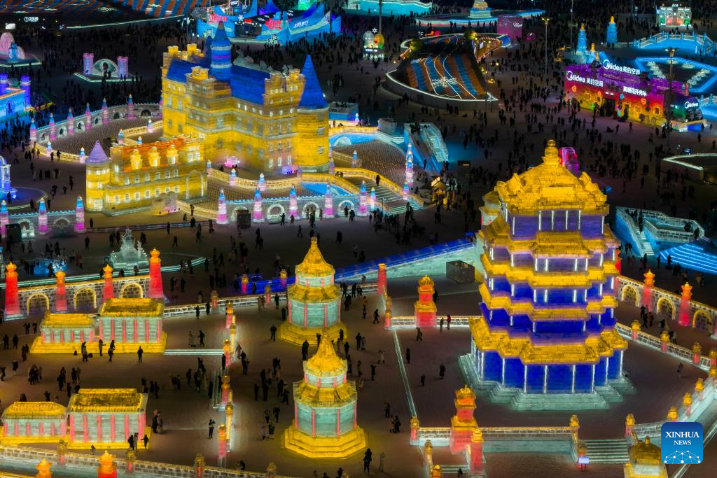 An aerial drone photo shows tourists visiting the Harbin Ice-Snow World in Harbin, northeast China's Heilongjiang Province, Dec. 31, 2025. Many scenic spots in the "Ice City" Harbin was illuminated Wednesday night, drawing tourists to celebrate the New Year. (Xinhua/Zhang Tao)