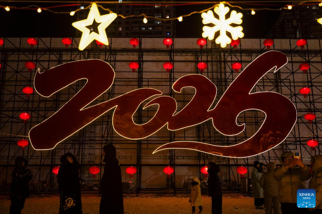 People have fun at the Heilongjiang Radio and TV Tower square in Harbin, northeast China's Heilongjiang Province, Dec. 31, 2025. Many scenic spots in the "Ice City" Harbin was illuminated Wednesday night, drawing tourists to celebrate the New Year. (Xinhua/Zhang Tao)