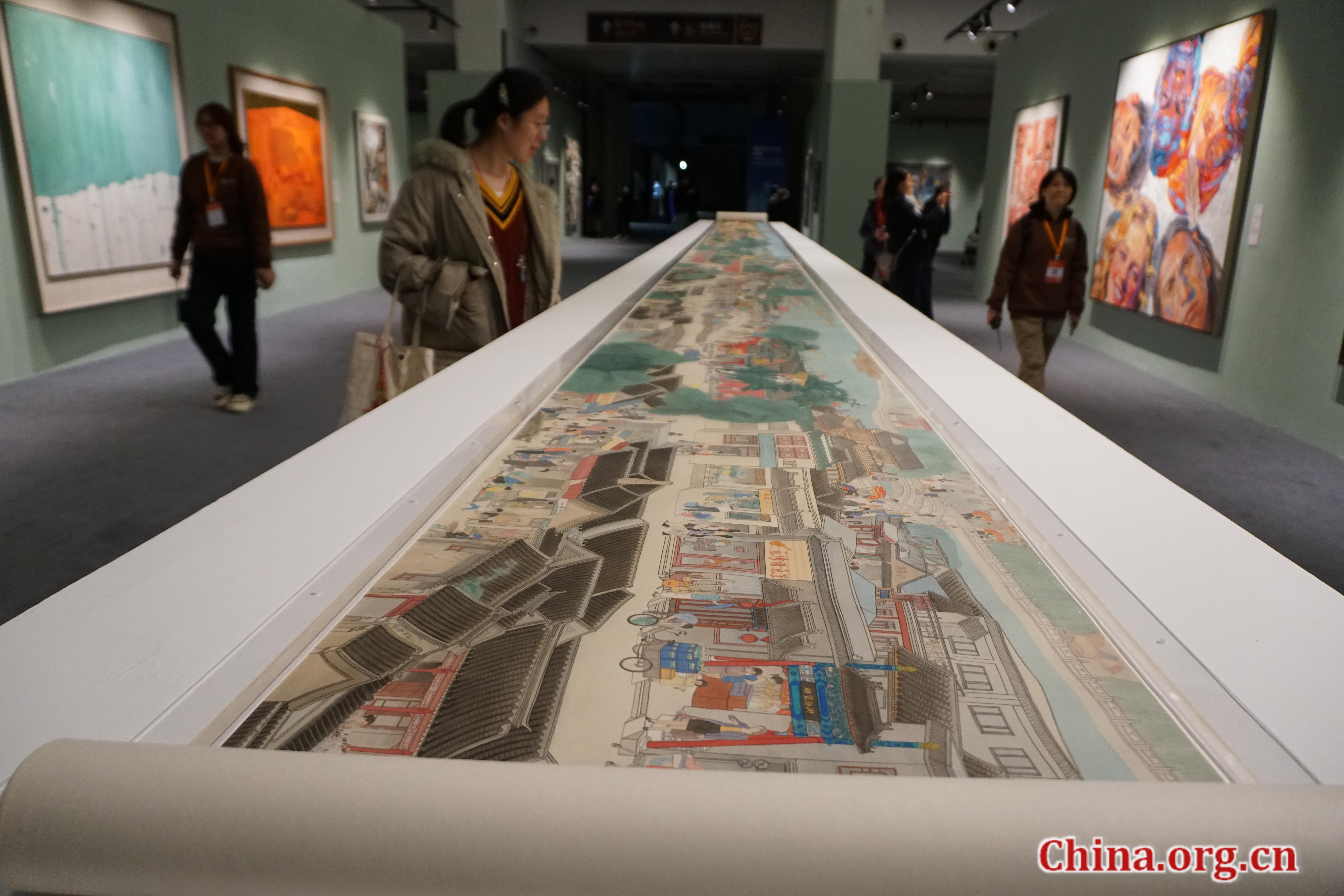 A visitor views a large-scale Chinese painting scroll at the 10th Beijing International Art Biennale in Beijing, Dec. 29, 2025. The work depicts daily life in Beijing. [Photo by Li Congrong/China.org.cn]