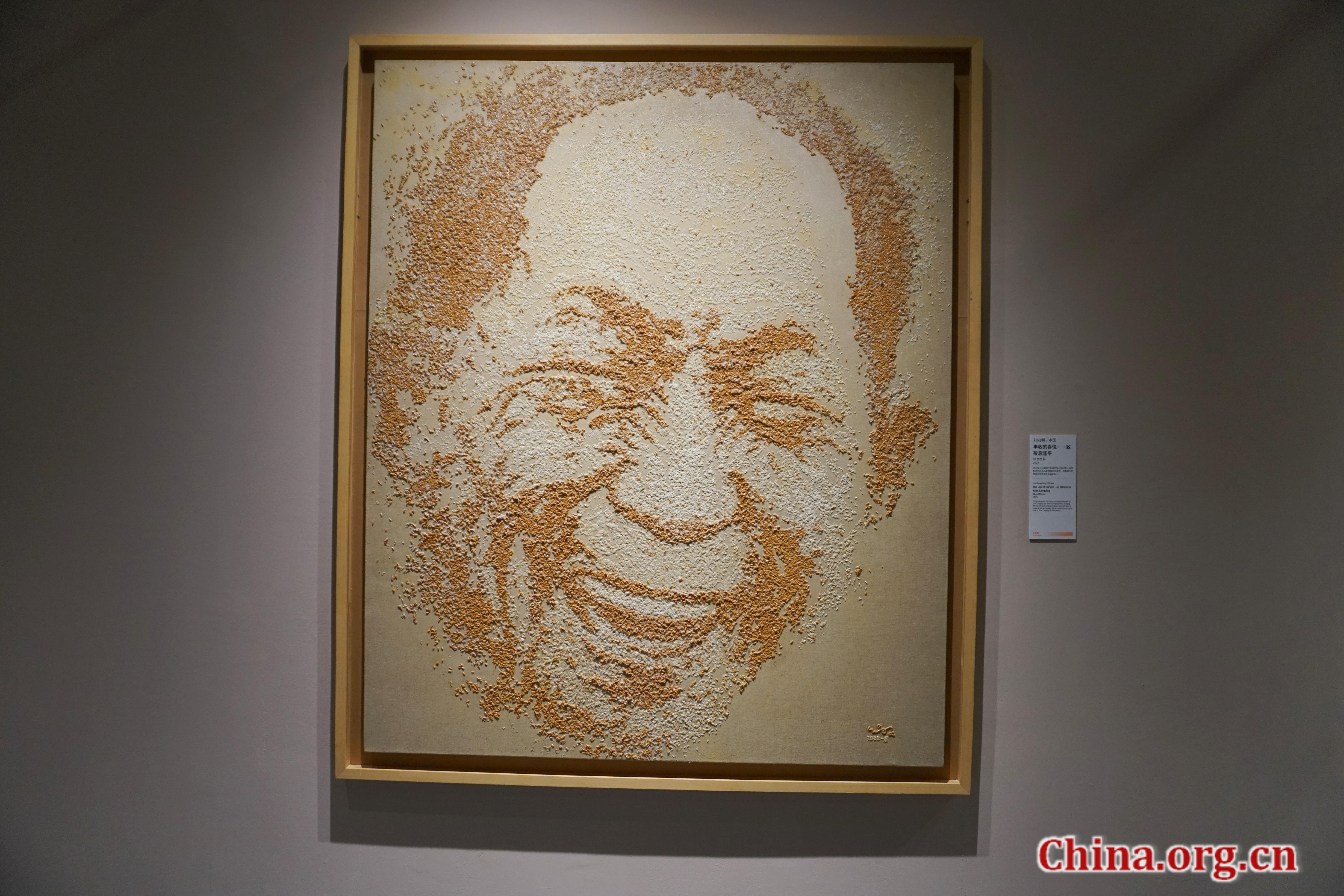 A mixed media work titled "The Joy of Harvest — In Tribute to Yuan Longping" is displayed at the 10th Beijing International Art Biennale in Beijing, Dec. 29, 2025. The piece incorporates rice seeds and grains developed by Yuan Longping, capturing the smile of "the Father of Hybrid Rice." [Photo by Li Congrong/China.org.cn]
