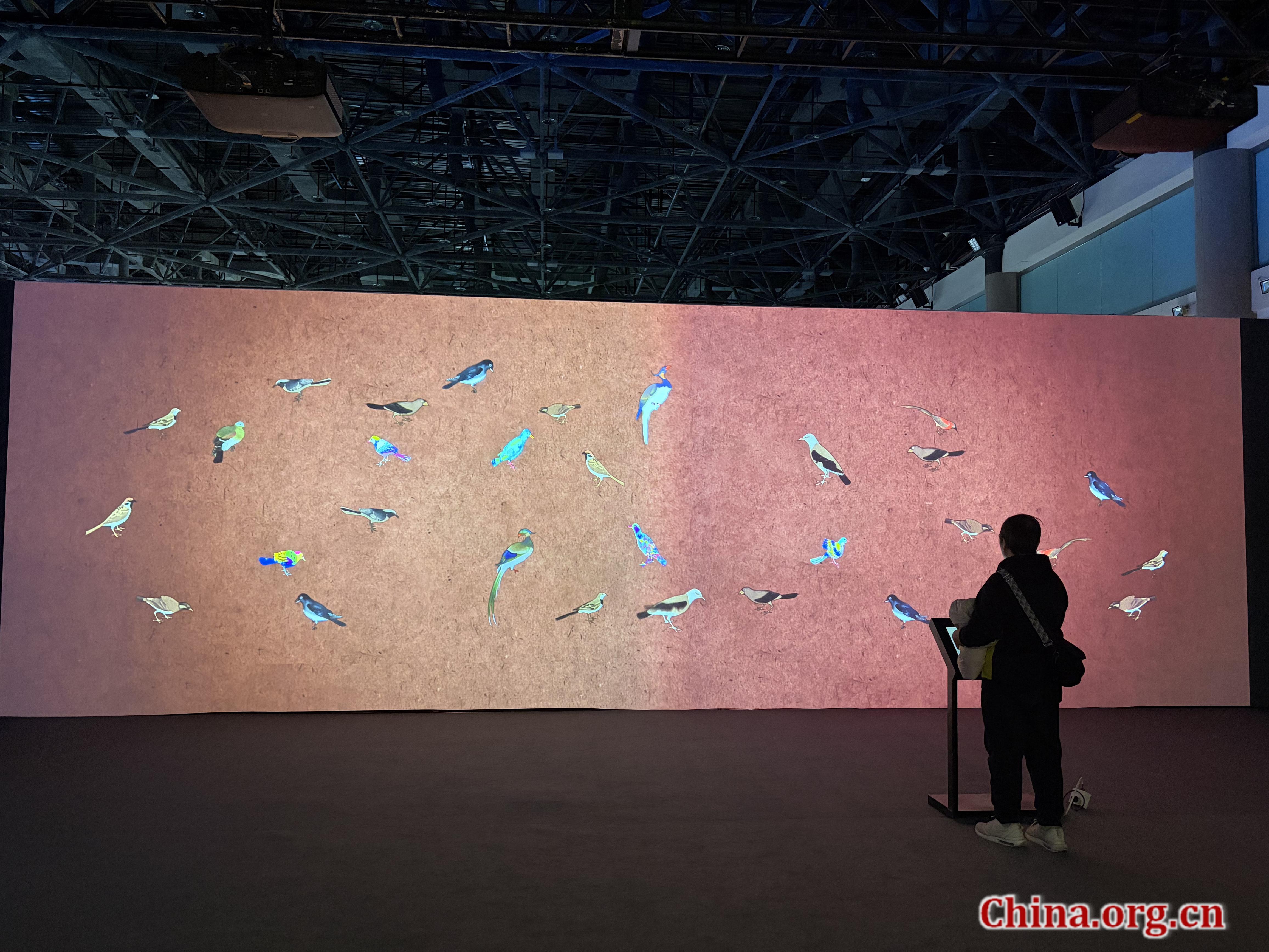 A visitor interacts with the installation "Portraits of Rare Birds Today" at the 10th Beijing International Art Biennale in Beijing, Dec. 29, 2025. The piece allows visitors to create their own rare birds on screen. [Photo by You Jiaxin/China.org.cn]