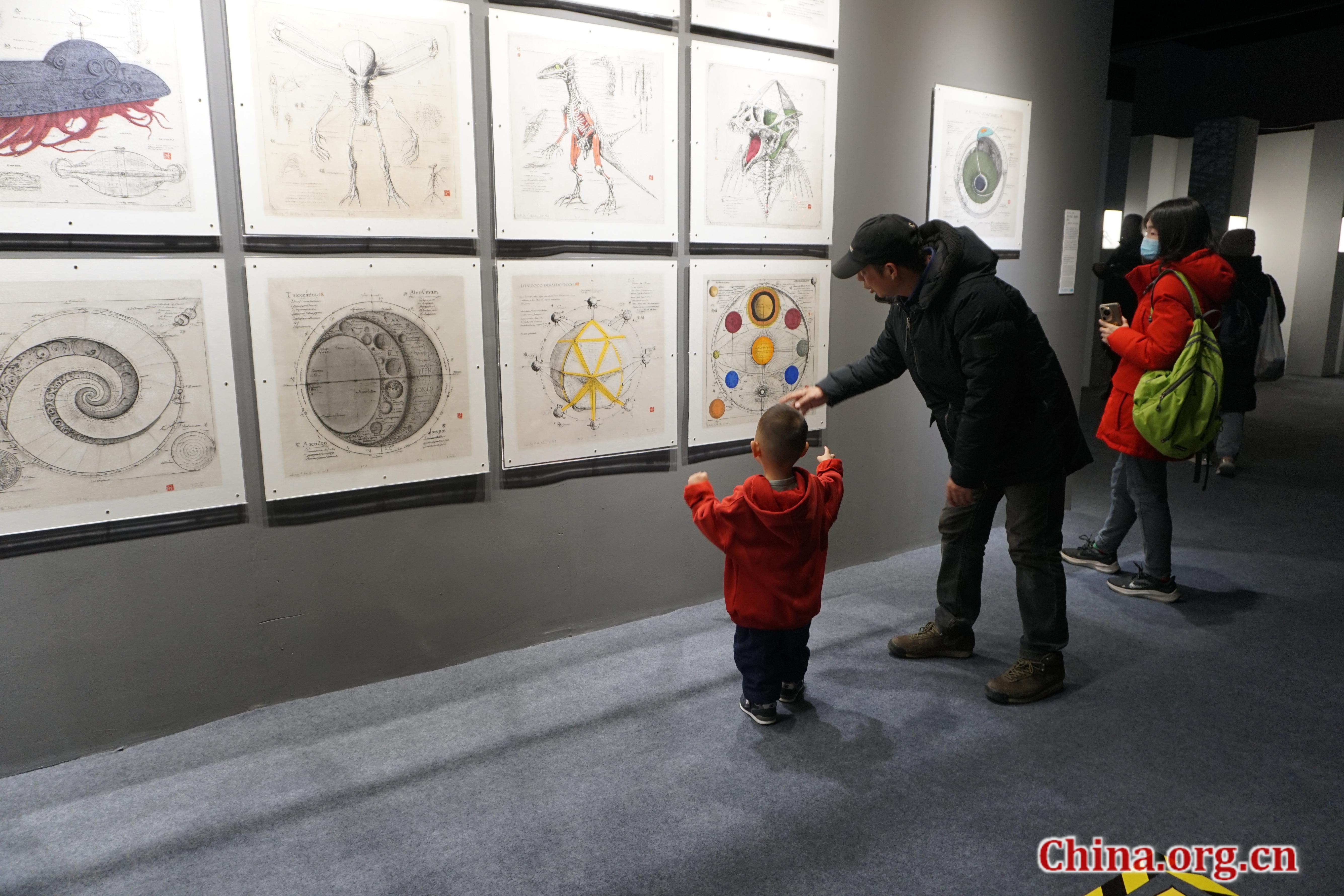 A visitor introduces paintings to a child at the 10th Beijing International Art Biennale in Beijing, Dec. 29, 2025. [Photo by Li Congrong/China.org.cn]