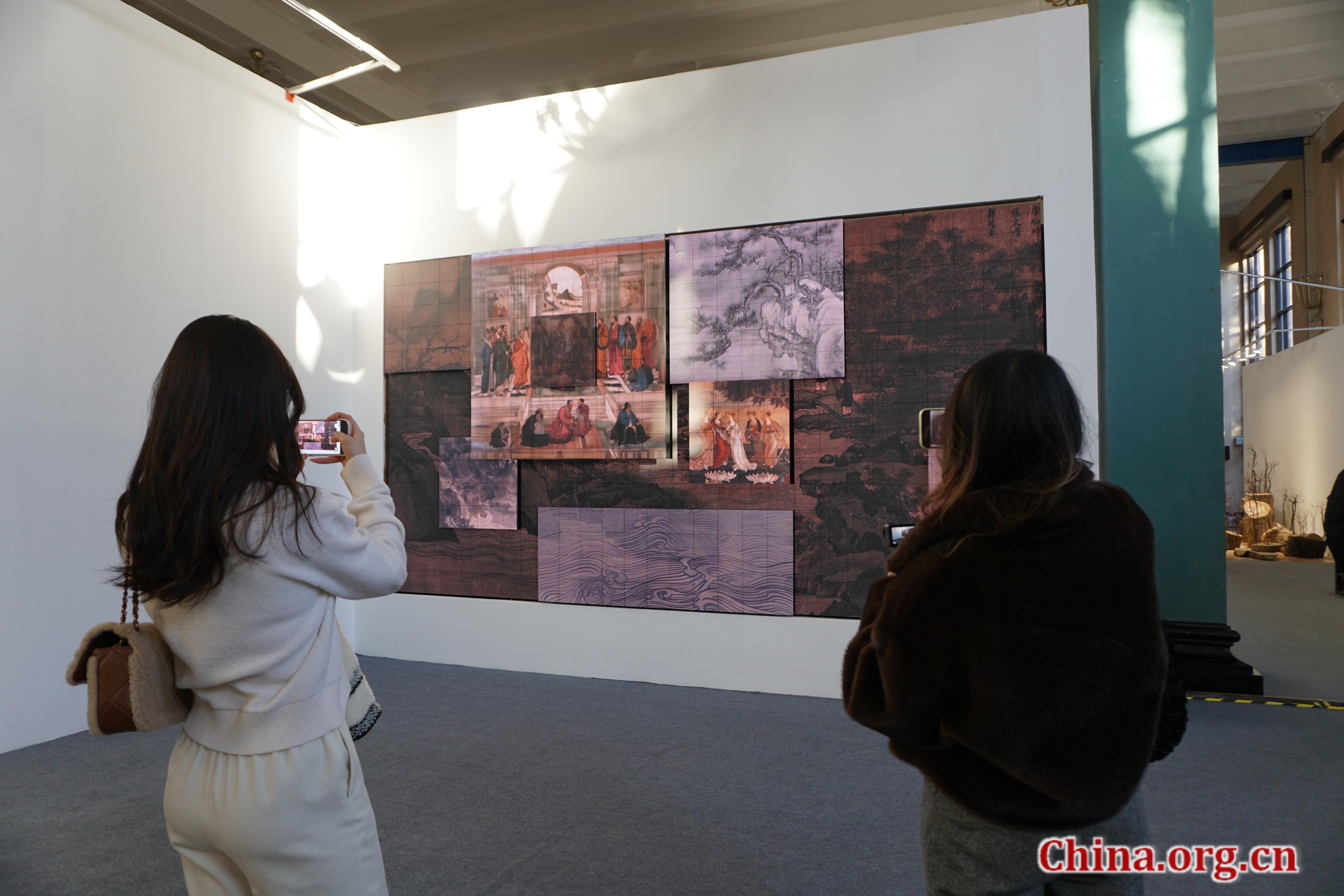 Visitors photograph an LED wave screen installation at the 10th Beijing International Art Biennale in Beijing, Dec. 29, 2025. The contemporary ink art exhibition features diverse forms of ink art compositions. [Photo by Li Congrong/China.org.cn]