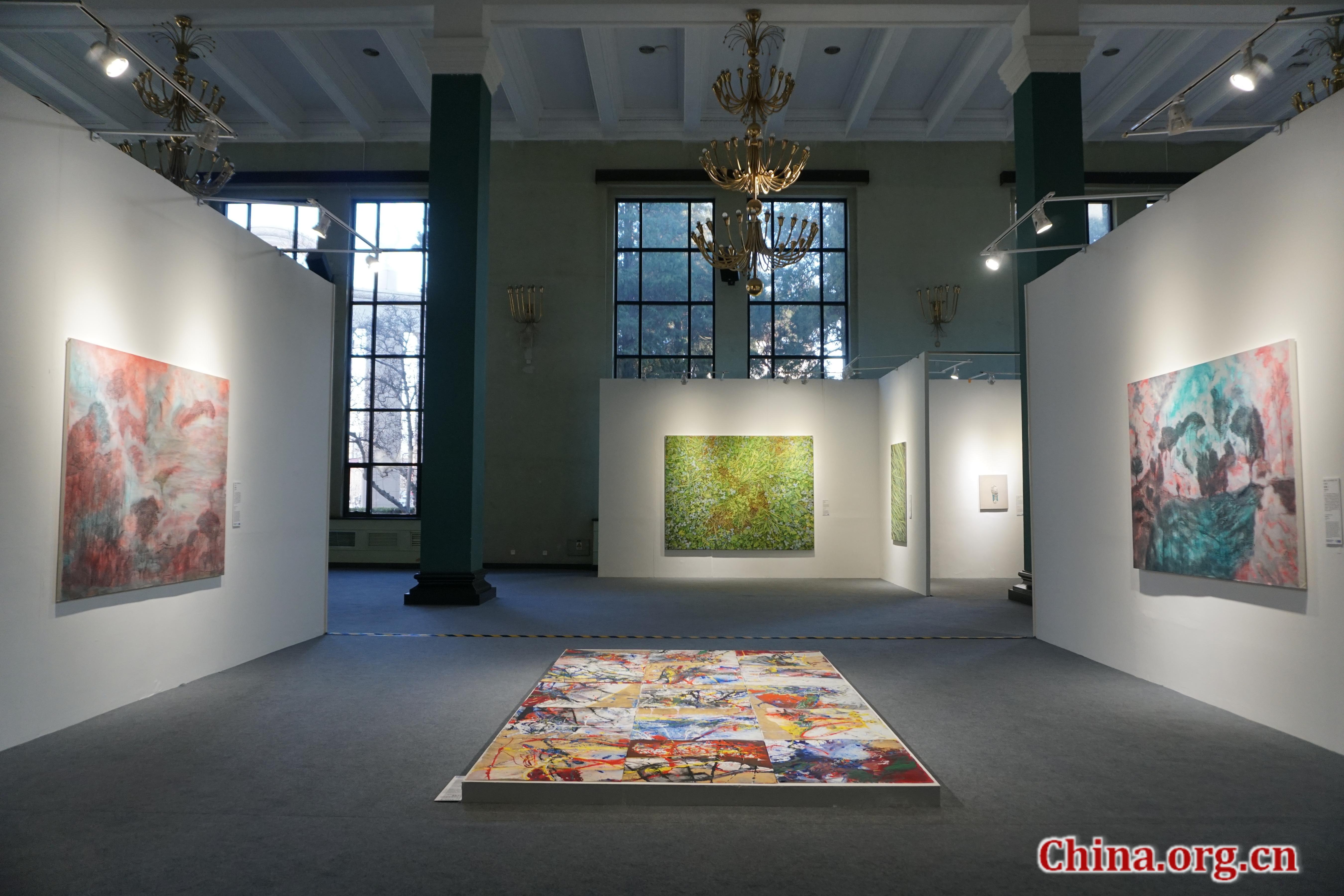 Paintings on display at the "Special Exhibition of the Contemporary Art of Serbia" at the 10th Beijing International Art Biennale in Beijing, Dec. 29, 2025. The exhibition features works by nearly 20 Serbian artists exploring the interplay between humanity, nature and technology. [Photo by Li Congrong/China.org.cn]
