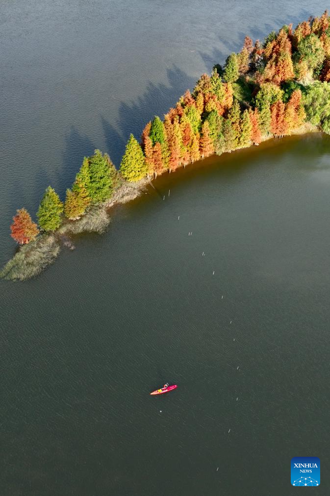 An aerial drone photo taken on Jan. 2, 2026 shows a tourist enjoying paddle boarding at Minjiang River wetland in Fuzhou, southeast China's Fujian Province. (Xinhua/Jiang Kehong)