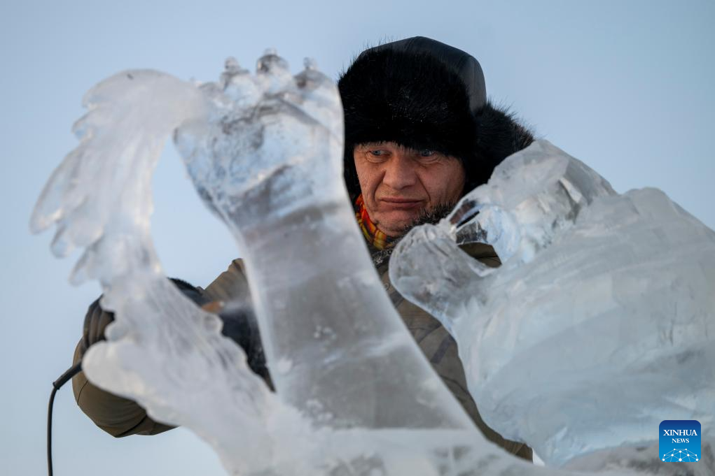 A competitor works on an ice sculpture during the 37th China Harbin International Ice Sculpture Competition at the Harbin Ice-Snow World in Harbin, northeast China's Heilongjiang Province, Jan. 3, 2026. The competition kicked off here on Friday. [Photo/Xinhua]