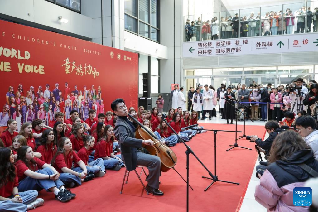 Feng Yao, the principal cellist of the Schleswig-Holstein Symphony Orchestra from Germany, performs at the Peking Union Medical College Hospital (PUMCH) in Beijing, capital of China, Dec. 31, 2025. Fifty-six young performers from One Voice Children's Choir along with invited musicians gave a performance at the hospital on Wednesday. [Photo/Xinhua]