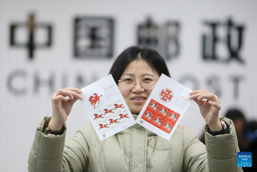 A woman shows special stamps marking the Year of the Horse in Yangzhou, east China's Jiangsu Province, Jan. 5, 2026. China Post on Monday unveiled a set of two special stamps to celebrate the upcoming Chinese zodiac Year of the Horse. (Photo by Meng Delong/Xinhua)