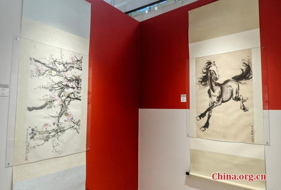 Two paintings by Xu Beihong — delicate bauhinia flowers and a galloping horse — are displayed side by side at Financial Street Shopping Center in Beijing, Jan. 5, 2026. [Photo by Liu Sitong/China.org.cn]]