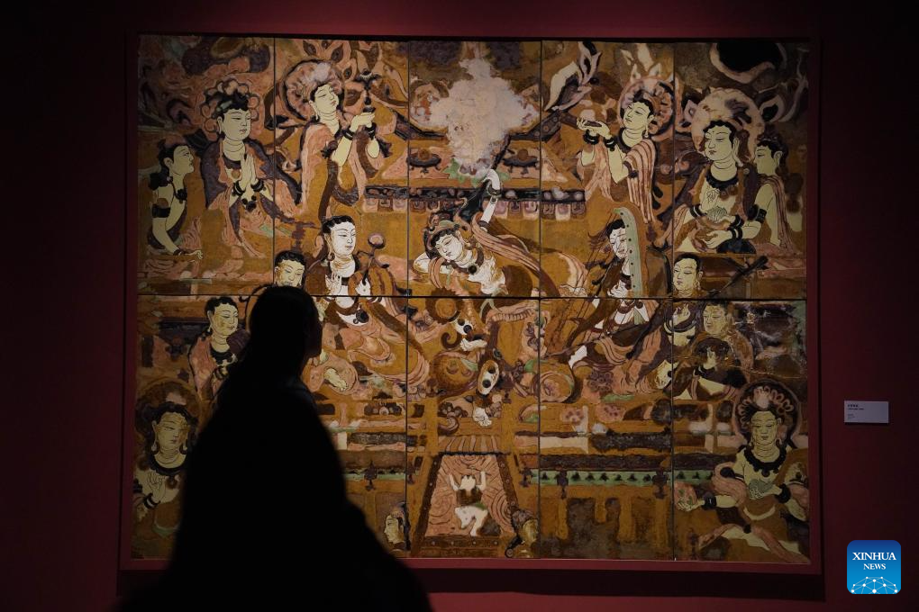 A person visits the "Dunhuang in Glazes" exhibition at the Jiangxi provincial art museum in Nanchang, east China's Jiangxi Province, Dec. 19, 2025. (Xinhua/Zhou Mi)