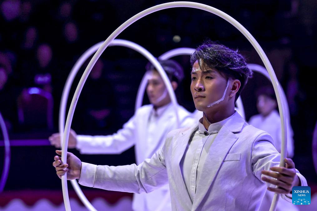 Members of the China National Acrobatic Troupe perform a hoop-diving act during the gala show of the 16th Budapest International Circus Festival in Budapest, Hungary, Jan. 12, 2026. The China National Acrobatic Troupe claimed the Grand Prix at the Budapest International Circus Festival. (Photo by David Balogh/Xinhua)