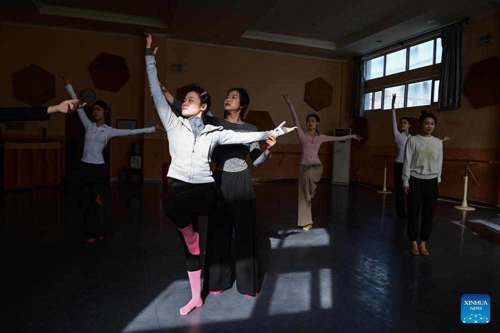 Actresses of the Shaanxi Provincial Song and Dance Troupe rehearse in Xi'an, northwest China's Shaanxi province, Jan. 15, 2026. [Photo/Xinhua]