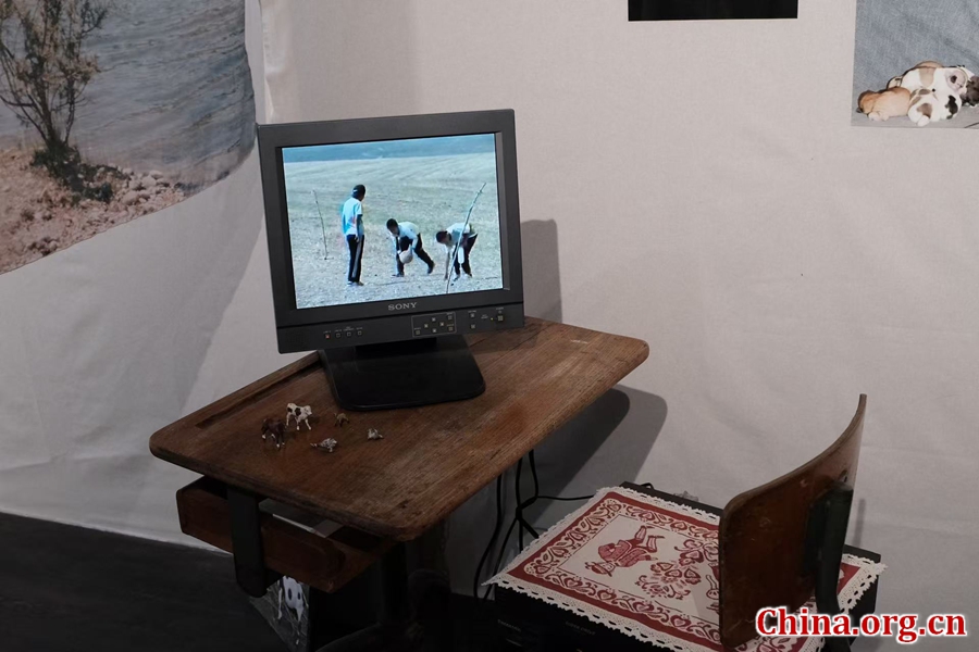 A video depicting the daily life of residents in the pastoral areas of China's Xinjiang Uygur Autonomous Region is screened on loop at the "Morning in the Wind" exhibition in Jianchang Hutong, Beijing, Jan. 16, 2026. [Photo by Liao Jiaxin/China.org.cn]
