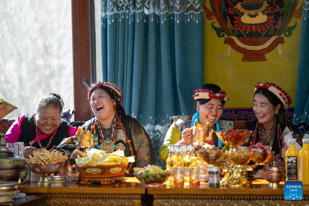 Villagers are pictured during a celebration of the farmers' New Year in Chusong Village of Nyarixung Township in Xigaze, southwest China's Xizang Autonomous Region, Jan. 20, 2026. Locals in Xigaze celebrate the farmers' New Year on the first day of the twelfth month of the Tibetan calendar. (Photo by Tenzin Norbu/Xinhua)