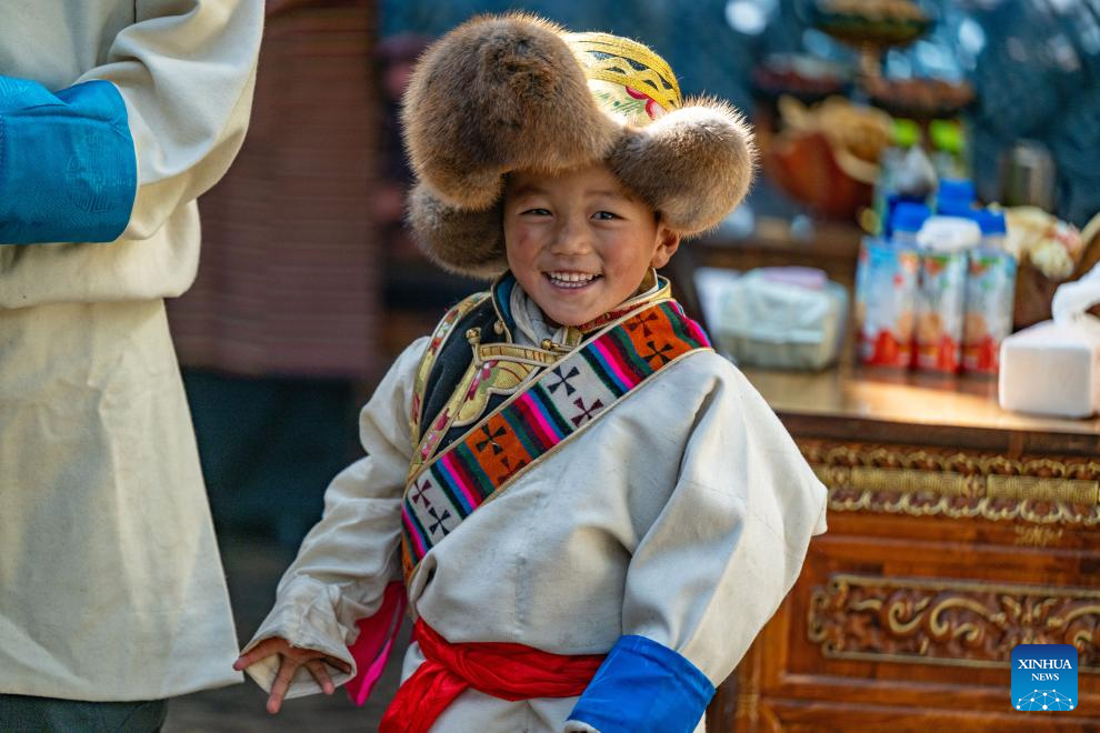 A child is pictured during a celebration of the farmers' New Year in Chusong Village of Nyarixung Township in Xigaze, southwest China's Xizang Autonomous Region, Jan. 20, 2026. Locals in Xigaze celebrate the farmers' New Year on the first day of the twelfth month of the Tibetan calendar. (Photo by Tenzin Norbu/Xinhua)