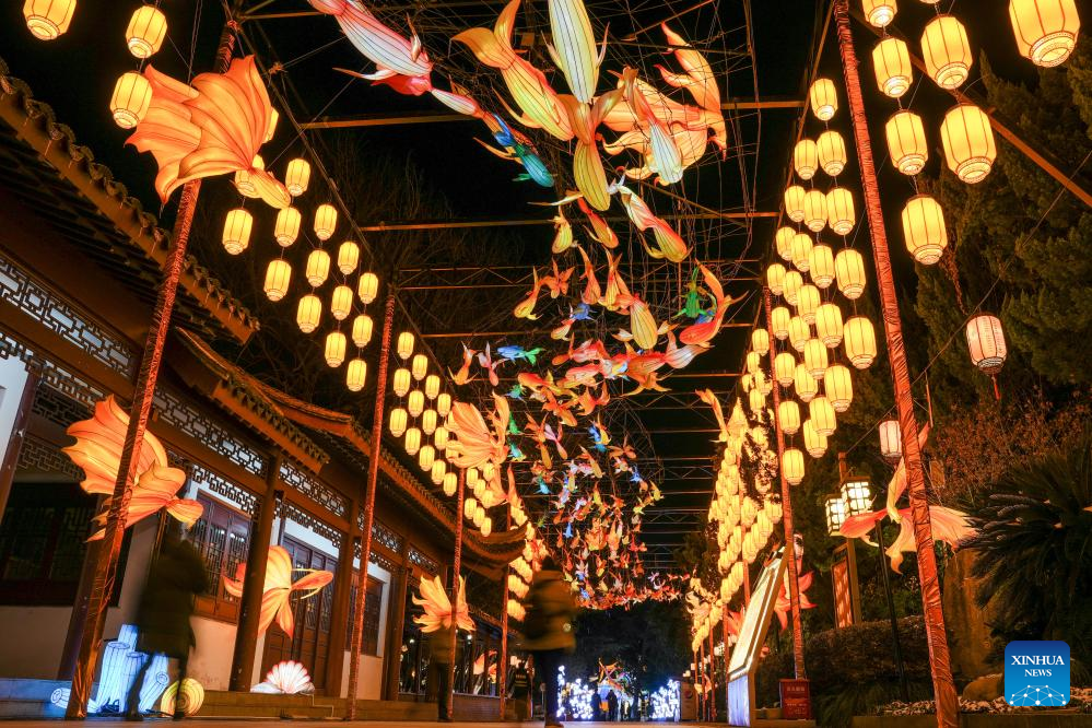 Tourists view light decorations displayed at the Bailuzhou Park during the 40th Qinhuai Lantern Festival in Nanjing, east China's Jiangsu Province, Jan. 21, 2026. The lighting ceremony of the festival was held at the Bailuzhou Park on Wednesday. The festival can be visited in several exhibition areas near the Qinhuai river in the city of Nanjing. [Photo/Xinhua]