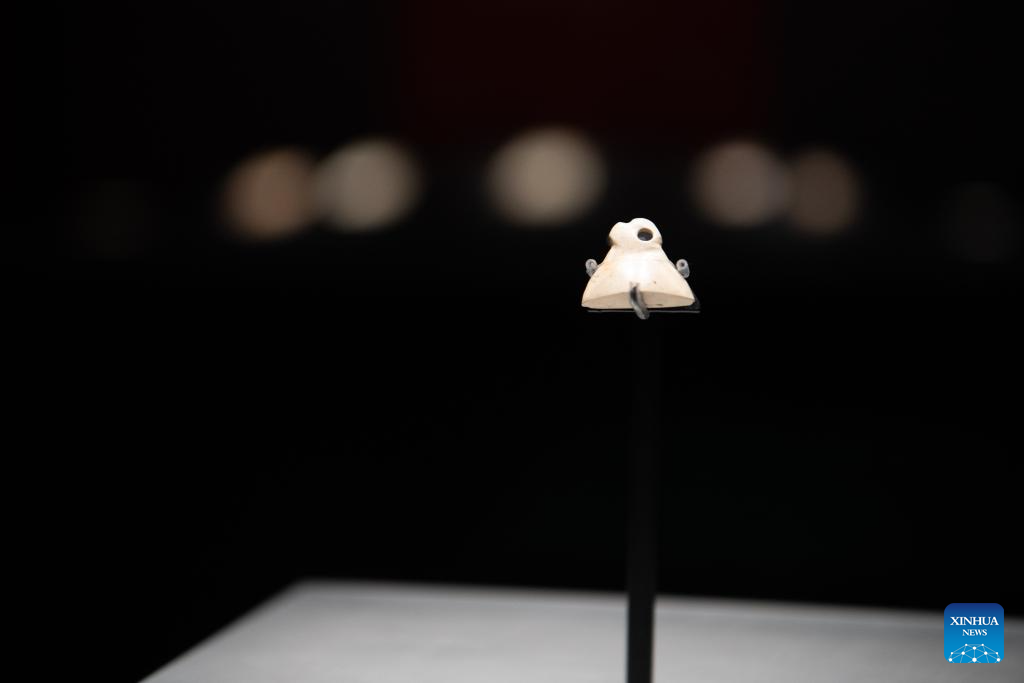 This photo taken on Dec. 24, 2025 shows a jade artifact on display at the Lingjiatan Site Museum in Hanshan County, Ma'anshan, east China's Anhui Province. Dating back some 5,300 to 5,800 years, the Lingjiatan relic site in east China's Anhui was discovered in 1985. It is known for the jadeware unearthed there. The findings include jade artifacts in various shapes, offering a peek into the spirits and aesthetics of a prehistoric Chinese jade culture. [Photo/Xinhua]