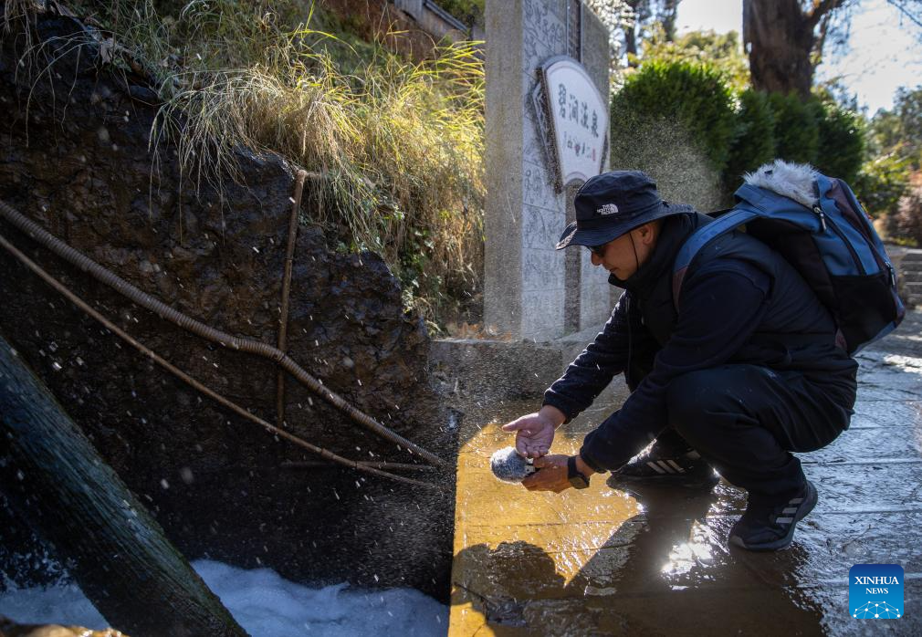 He Dehua collects the sounds of flowing water at a park at the ancient city of Lijiang, southwest China's Yunnan Province, Jan. 16, 2026. [Photo/Xinhua]