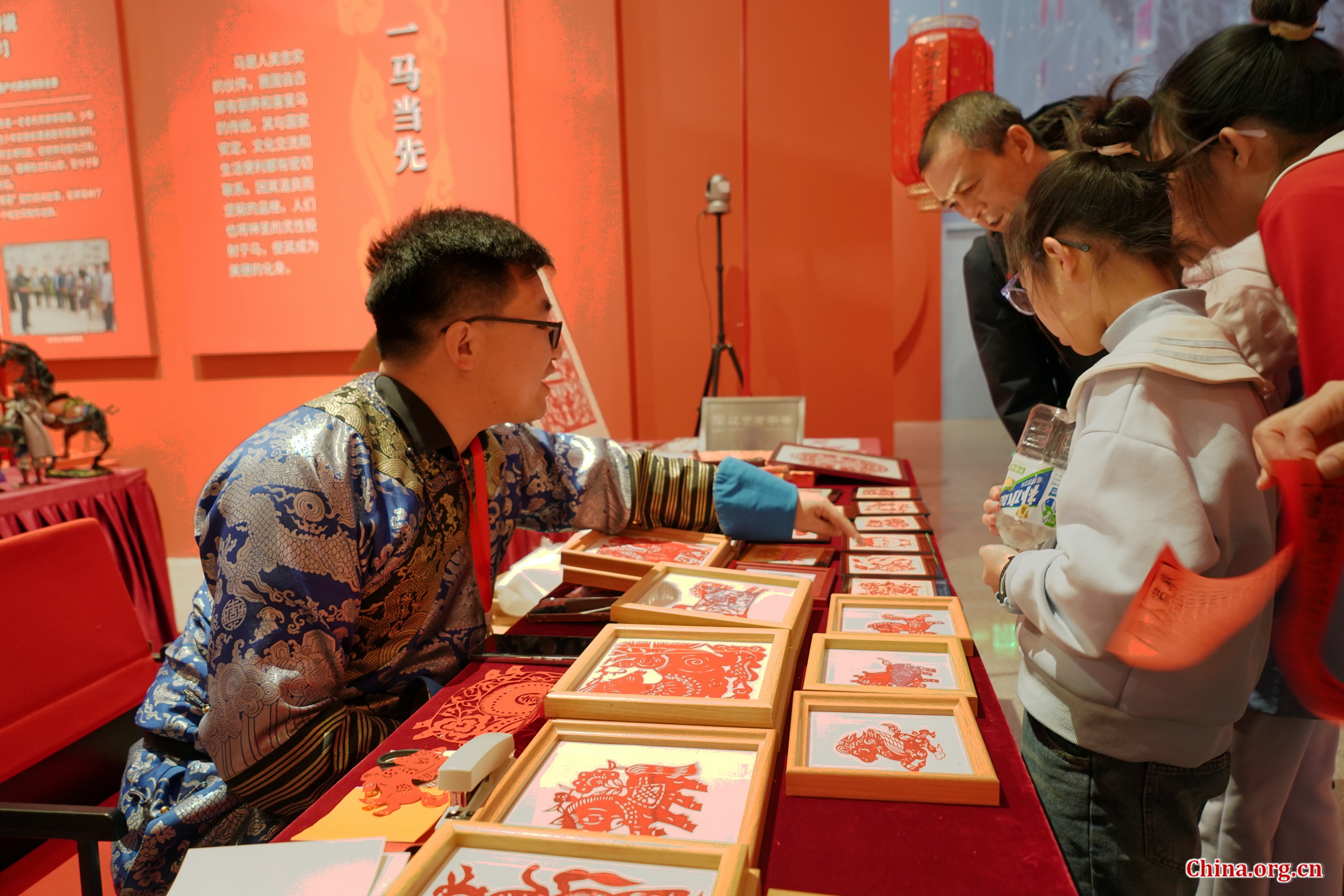 Zhao Congzhuo, 12th-generation inheritor of the Manchu Irgen Gioro paper-cutting craft, introduces his artworks to visitors at the Chinese Traditional Culture Museum in Beijing, Jan. 21, 2026. [Photo by Wang Yiming/China.org.cn]