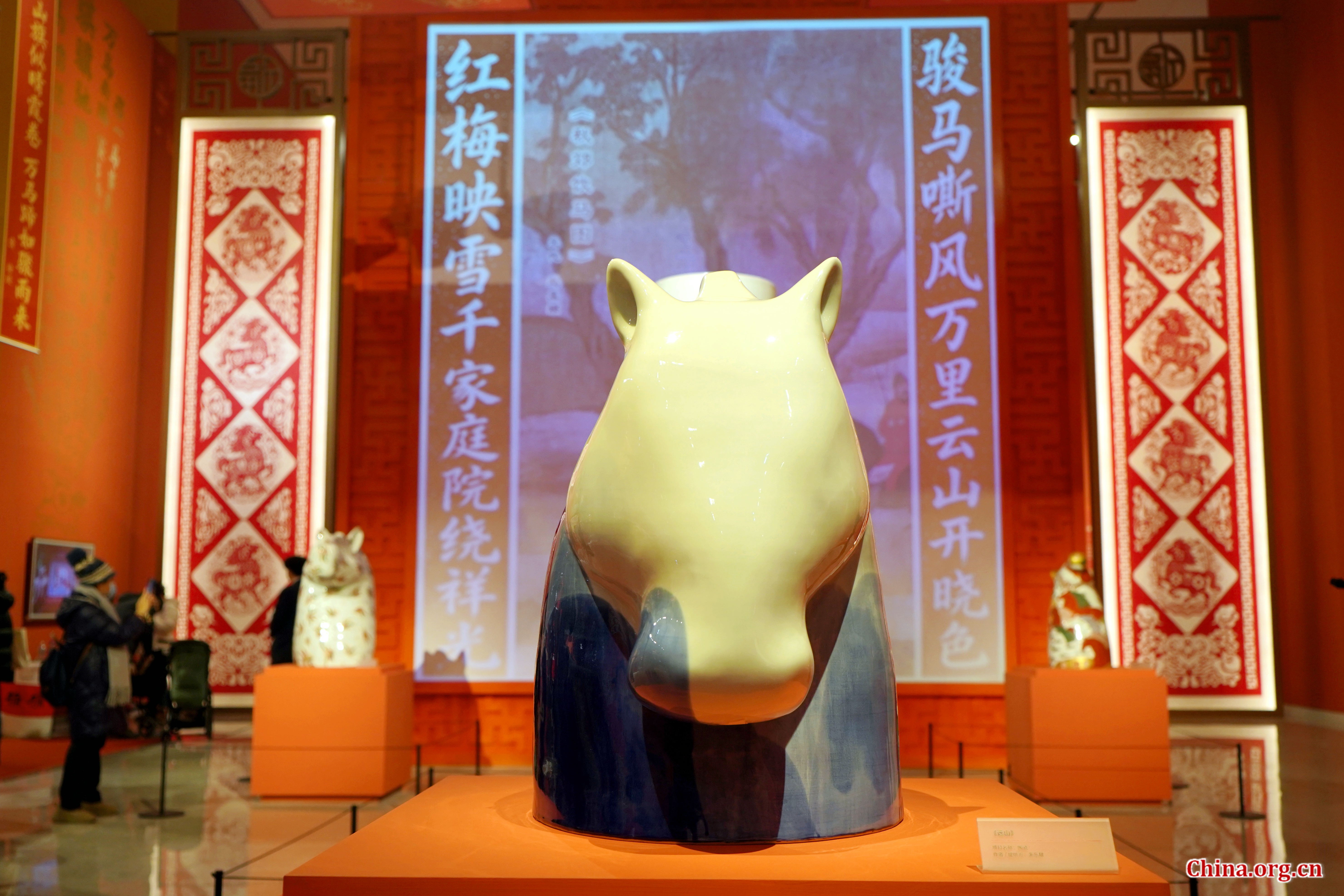 A large ceramic horse-head sculpture is exhibited against a backdrop of traditional Chinese couplets at the Chinese Traditional Culture Museum in Beijing, Jan. 21, 2026. [Photo by Wang Yiming/China.org.cn]