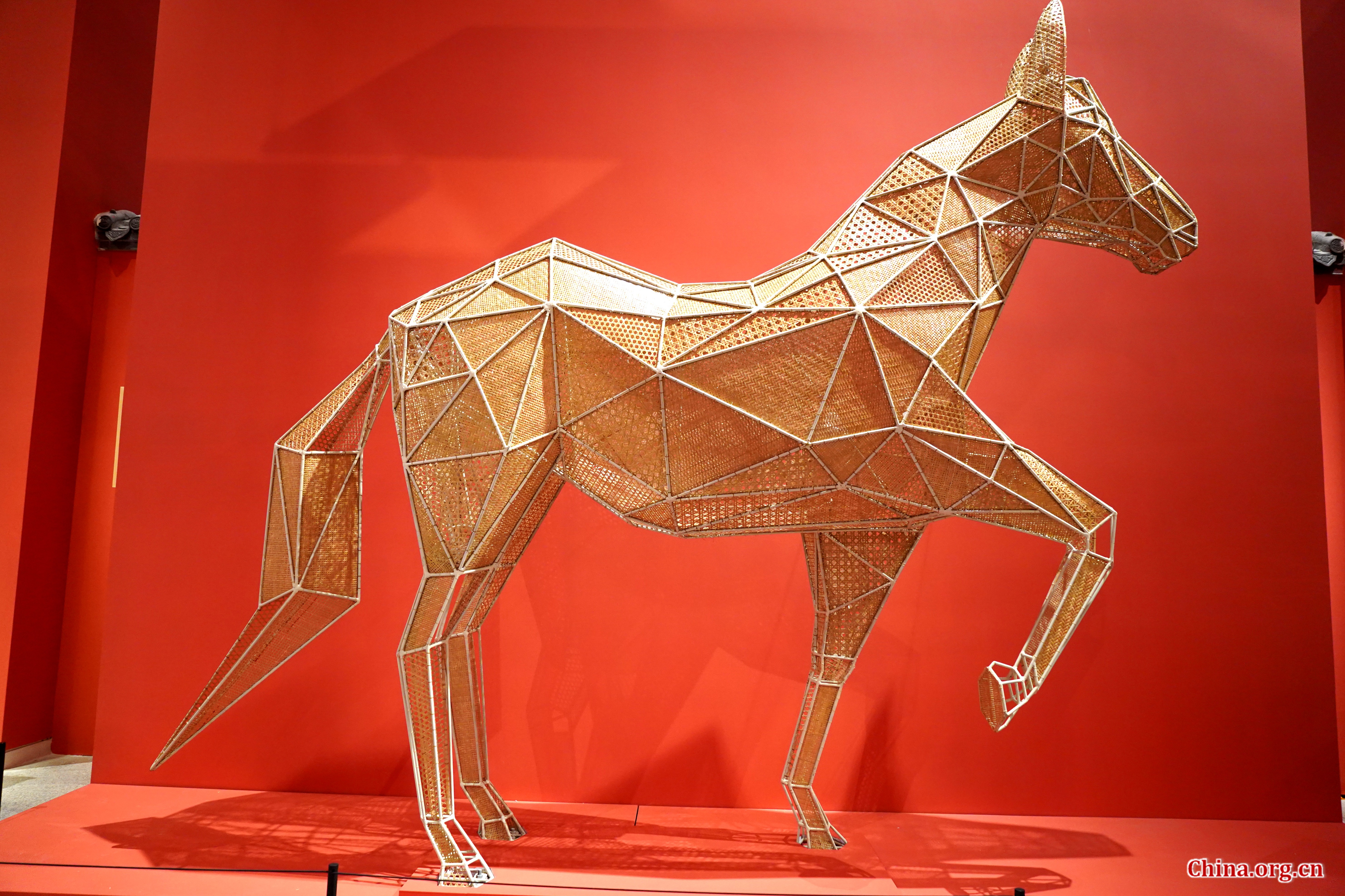 A bamboo-woven horse, showcasing the intricate skill of traditional Chinese weaving, on display at the Chinese Traditional Culture Museum in Beijing, Jan. 21, 2026. [Photo by Wang Yiming/China.org.cn]