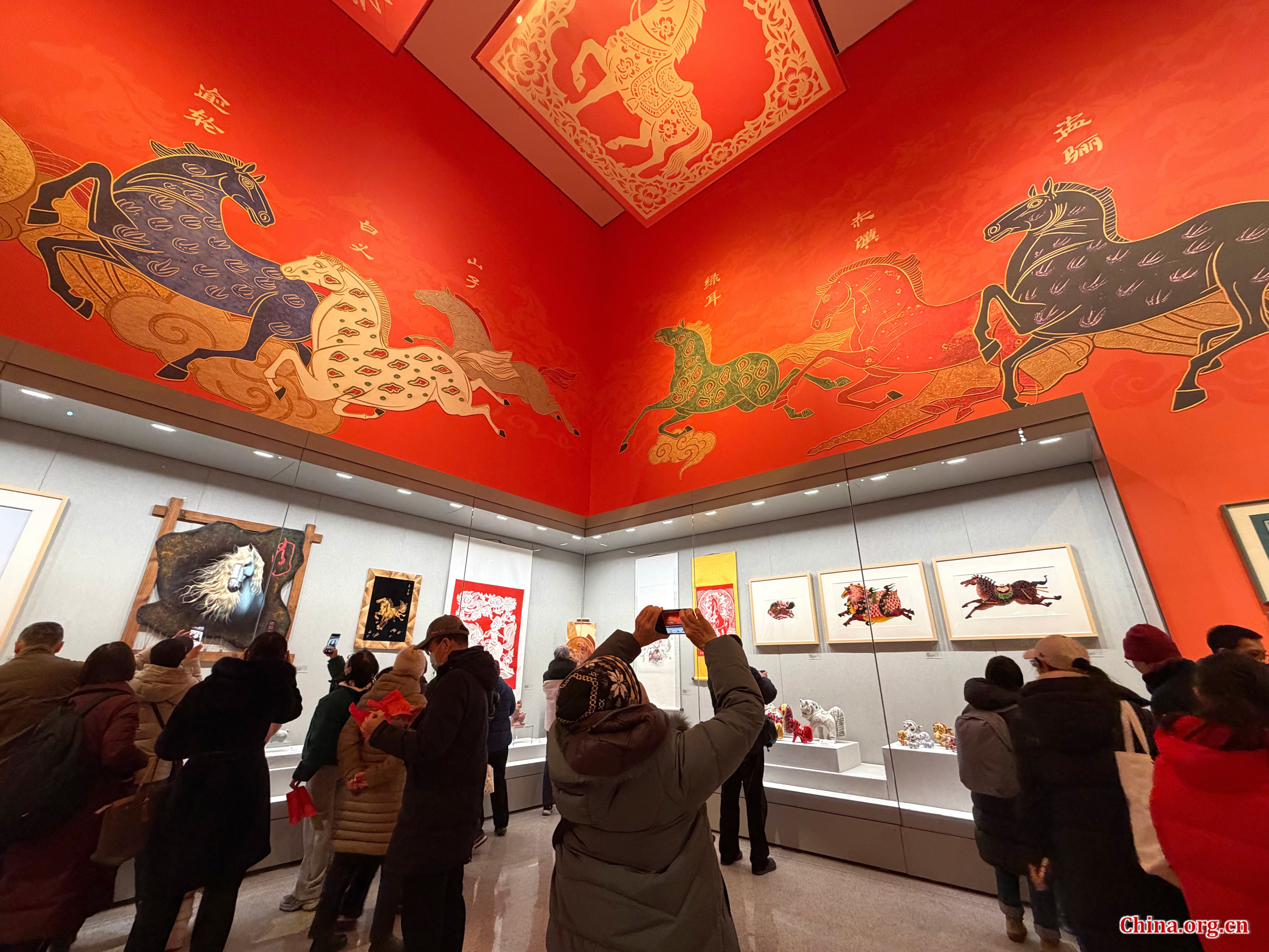 Visitors view horse-themed artworks, reflecting China's intangible cultural heritage, at the Chinese Traditional Culture Museum in Beijing, Jan. 21, 2026. [Photo by Wang Yiming/China.org.cn]
