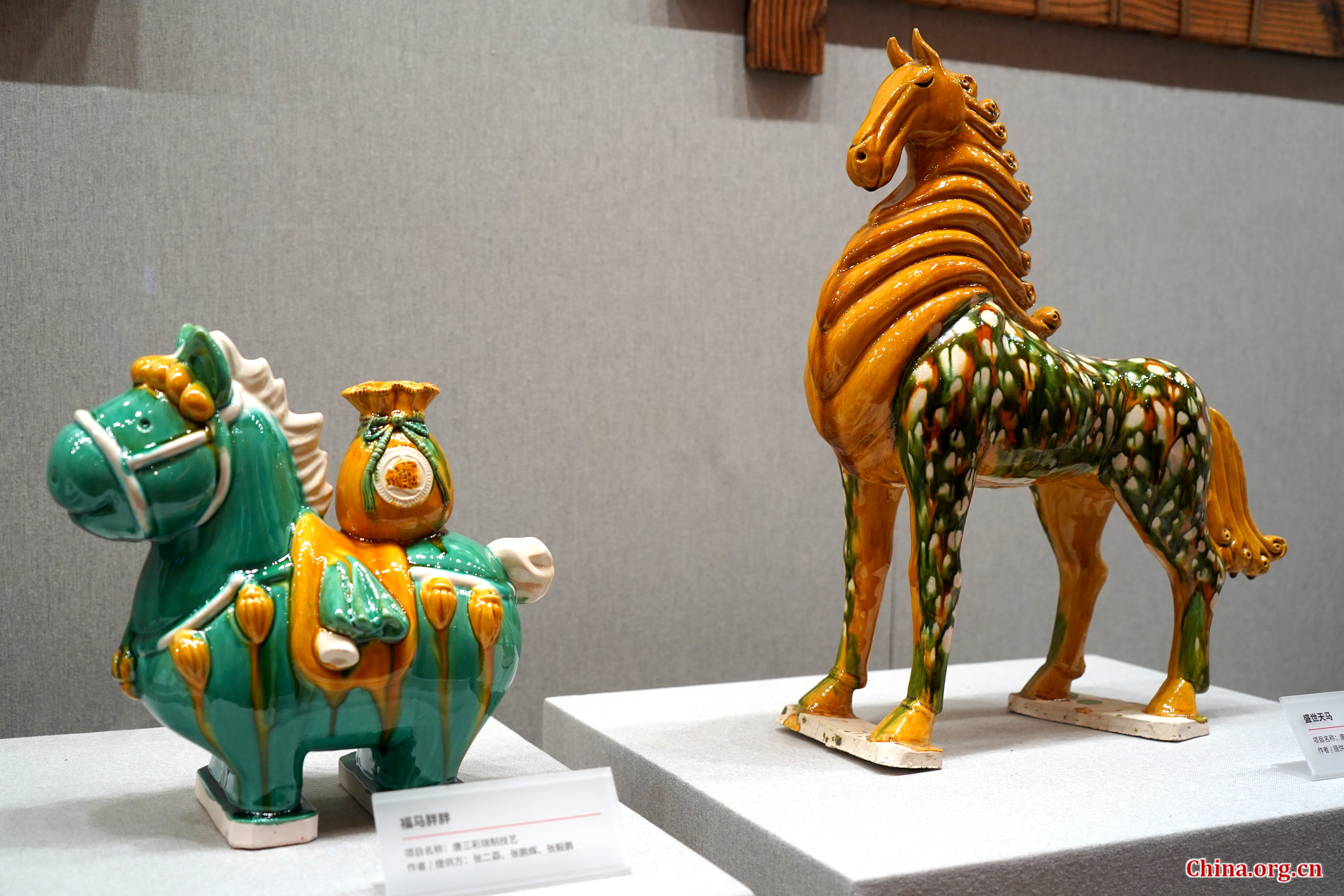 Tri-color glazed horse figurines, a traditional Chinese ceramic craft, on display at the Chinese Traditional Culture Museum in Beijing, Jan. 21, 2026. [Photo by Wang Yiming/China.org.cn]