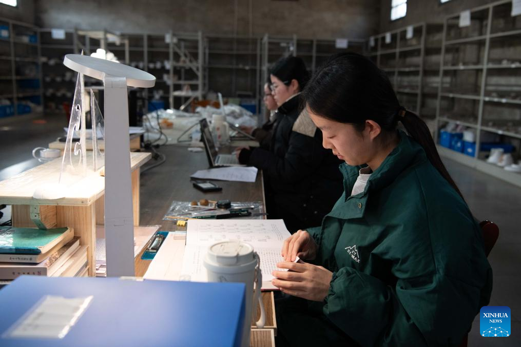 Archaeologists work at the research station of the Lingjiatan relics site in Hanshan County, Ma'anshan, east China's Anhui Province, Jan. 13, 2026. The Lingjiatan relics site in east China's Anhui is a Neolithic settlement dating back 5,300 to 5,800 years, with an area of about 1.6 million square meters.