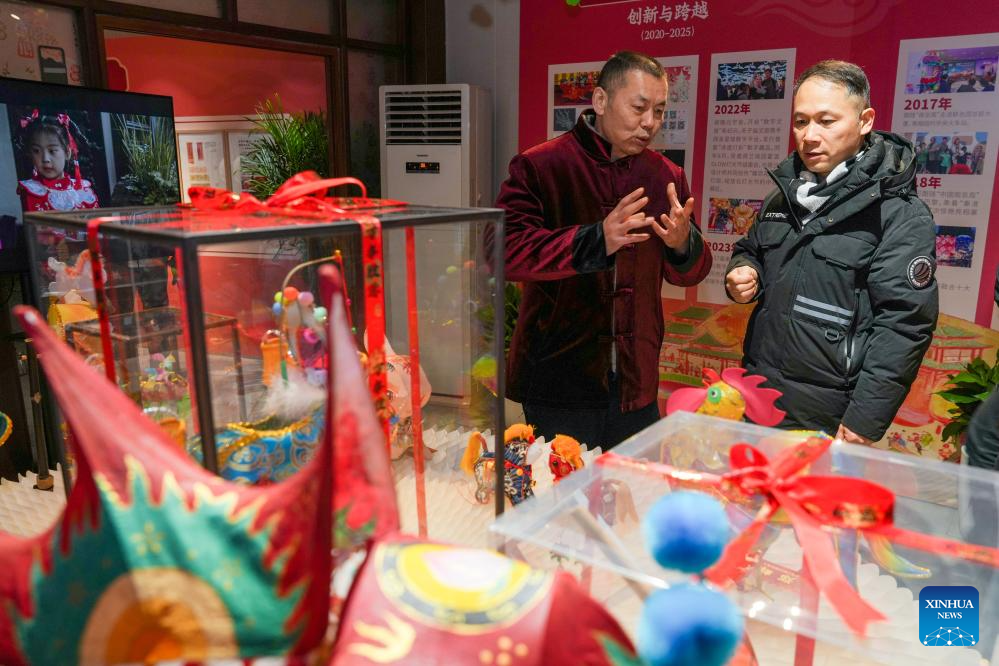 Lu Min (L) introduces the procedures of lantern making during the 40th Qinhuai Lantern Festival at the Bailuzhou Park in Nanjing, east China's Jiangsu Province, Jan. 21, 2026. [Photo/Xinhua]