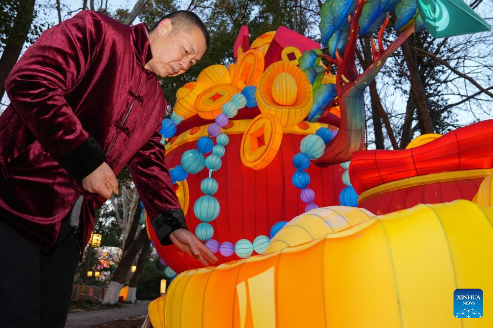 Lu Min checks the light installation work during the 40th Qinhuai Lantern Festival at the Bailuzhou Park in Nanjing, east China's Jiangsu Province, Jan. 21, 2026. [Photo/Xinhua]