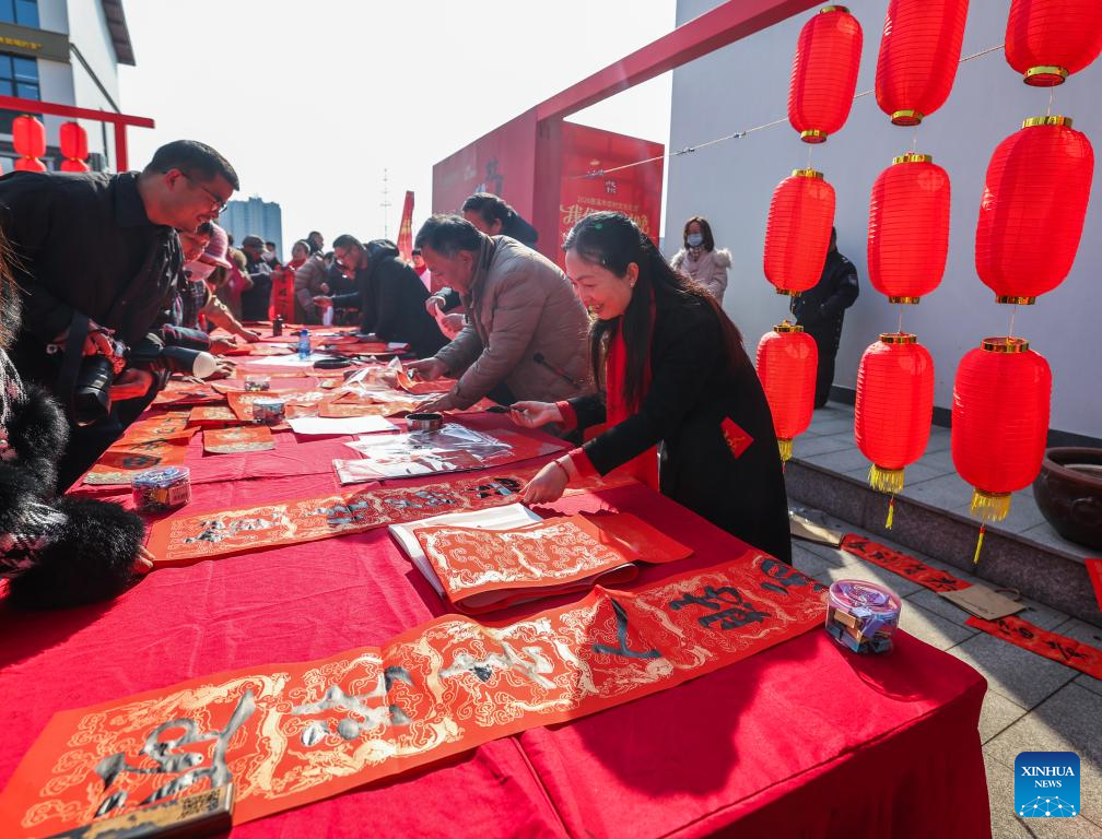 Chinese calligraphy enthusiasts write spring couplets and Chinese character "Fu", which means good fortune, for villagers during a folk customs event to celebrate the upcoming Spring Festival in Wan'anzhuang Village, Zhuoxiang Town of Cixi City, east China's Zhejiang Province, Jan. 22, 2026. [Photo/Xinhua]