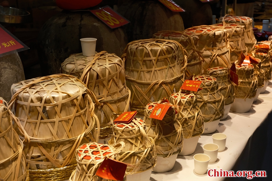 A selection of Huadiao rice wines from Shaoxing city in Zhejiang province on display at the fair in Beijing, Jan. 25, 2026. [Photo by Liao Jiaxin/China.org.cn]