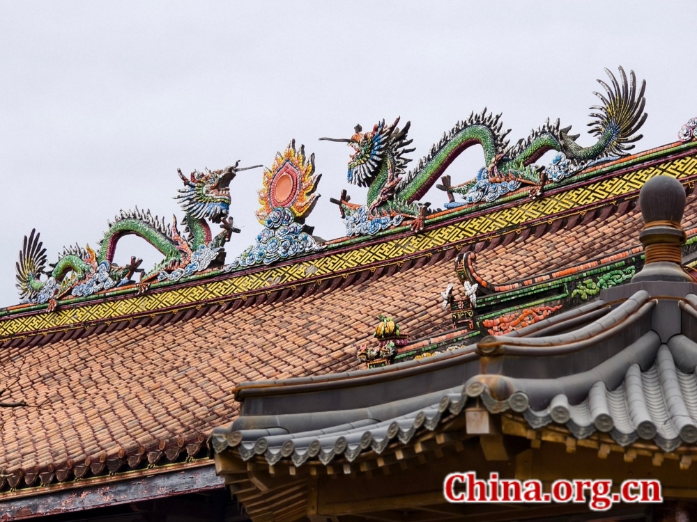 Inlaid porcelain twin dragons on a temple rooftop in Chaozhou, Guangdong province, Jan. 23, 2026. [Photo by Gong Yingchun/China.org.cn]