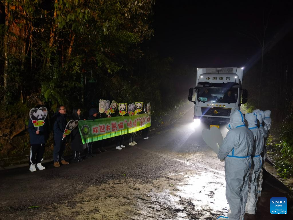 Giant pandas Xiao Xiao and Lei Lei arrive at the Ya'an base of China Conservation and Research Center for the Giant Panda in southwest China's Sichuan province on Jan. 28, 2026.