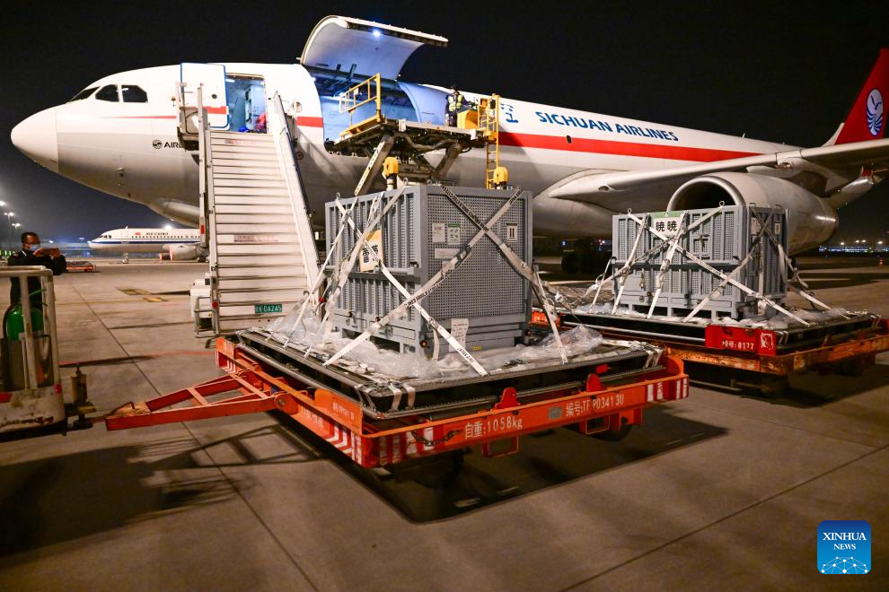 Giant pandas Xiao Xiao and Lei Lei arrive at the Chengdu Tianfu International Airport in Chengdu, southwest China's Sichuan province, Jan. 28, 2026.