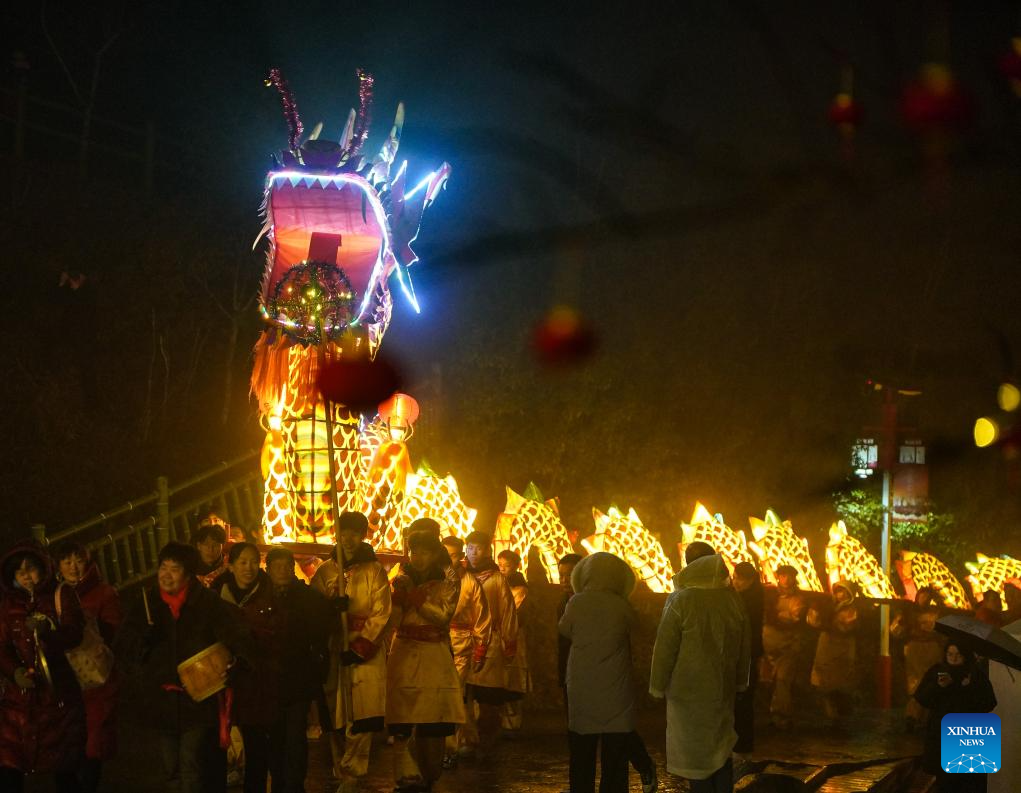 A wooden-bench dragon dance is performed during the Spring Festival gala held in Shenshan Village, Jinggangshan City of east China's Jiangxi Province, Jan. 31, 2026. With the Spring Festival drawing near, Shenshan Village in Jinggangshan City held a Spring Festival gala that invited residents from seven nearby counties in east China's Jiangxi and central China's Hunan provinces to participate. [Photo/Xinhua]