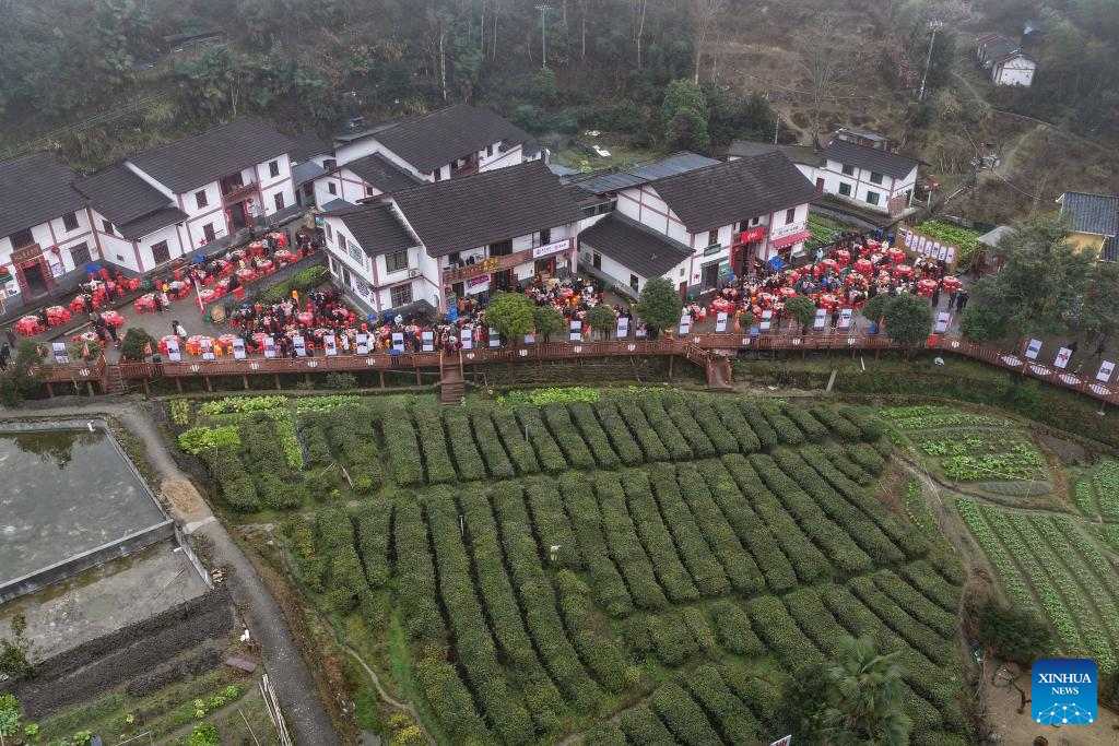This aerial drone photo taken on Feb. 1, 2026 shows a banquet held during the Spring Festival gala in Shenshan Village, Jinggangshan City of east China's Jiangxi Province. With the Spring Festival drawing near, Shenshan Village in Jinggangshan City held a Spring Festival gala that invited residents from seven nearby counties in east China's Jiangxi and central China's Hunan provinces to participate. [Photo/Xinhua]