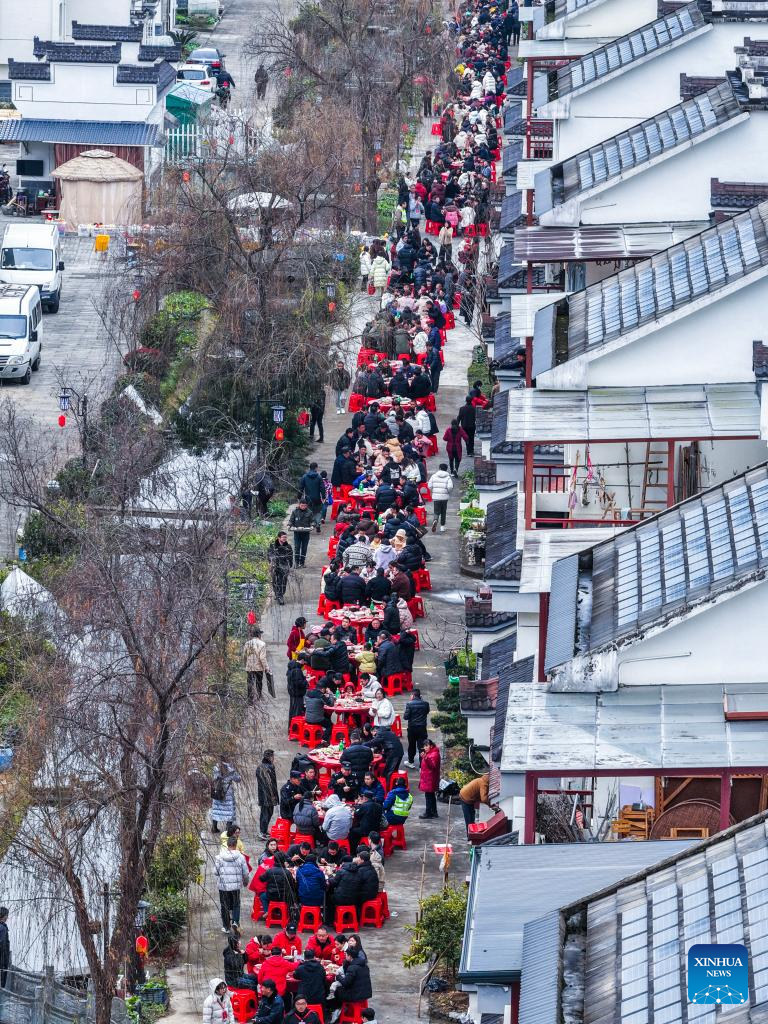 An aerial drone photo taken on Feb. 1, 2026 shows people dining on the street in Lianhua Township, east China's Zhejiang Province. A Spring Festival cultural event was held here with great enthusiasm on Sunday. Local residents and tourists enjoyed the festive market, viewed the local art exhibition, participated in traditional games, and savored local foods. [Photo/Xinhua]